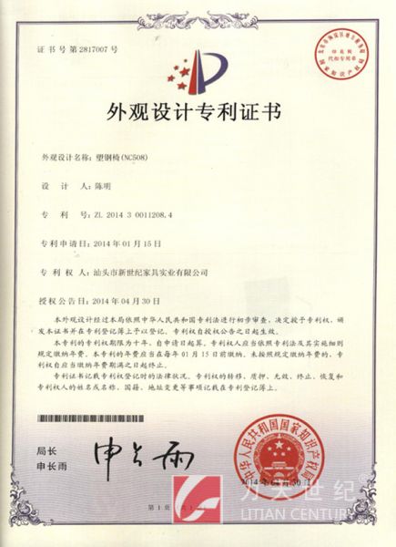 塑钢椅(NC508)外观设计专利证书